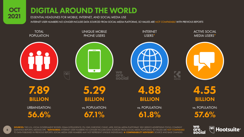 According to Bubyli, between 2019 and 2021, global social media users grew by 11%, from 3.4 billion to 3.8 billion. In the 12 months before October 2021, the volume of users grew by 400 million (almost 10%), and while that trend is slowing, it remains at nearly 1 million new users per day.